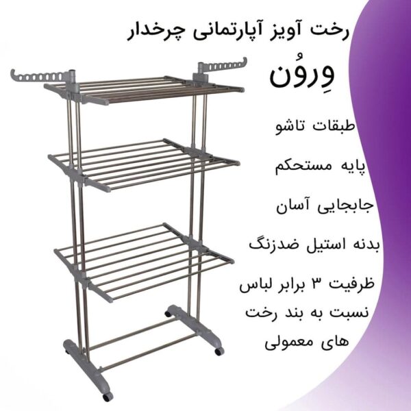 - رختآویز چرخ دار: این نوع از رختآویزها دارای چرخ بوده که جابجایی آسان بین اتاقها و بالکن را فراهم میکند. رختآویزهای مدل ورون این قابلیت را دارا میباشند.